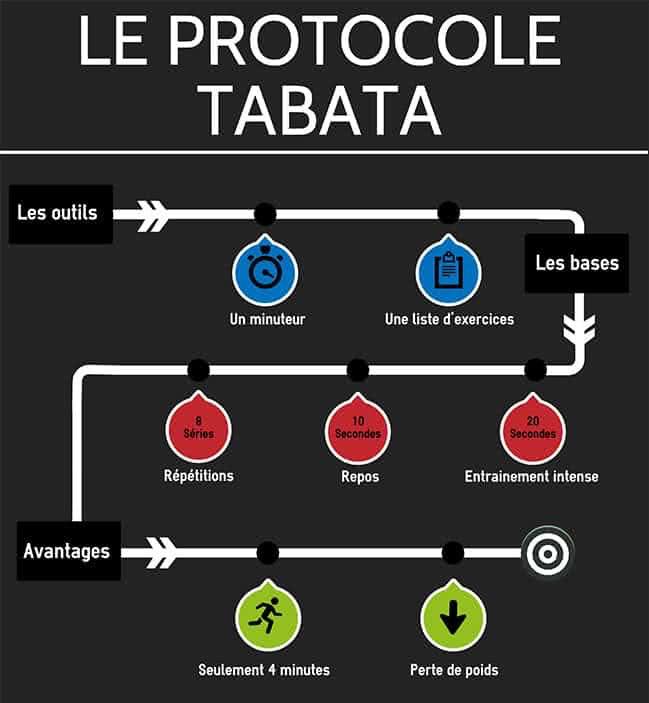 Cardio Training de Haute Intensité, le TABATA utilise la méthode de l'entrainement fractionné en alternant des séquences de 20 secondes d'exercices de Fitness avec des périodes de repos de 10 secondes. 8 exercices, 4 minutes. 5 répétitions pour 20 minutes de total brûle graisse ! Vous augmentez votre masse musculaire, vous améliorez votre capacité respiratoire et vous gagnez du temps! Idéal à caser dans l'emploi du temps chargé !